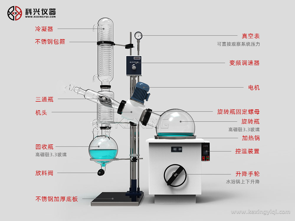 大型旋轉蒸發儀用途特點:大容量、大口徑旋轉蒸發瓶,蒸發面積大,減壓置于水浴中,邊旋轉邊加熱,使溶液高效擴散蒸發,可用于生物、醫藥、化工、食品等領域的小試、中試。